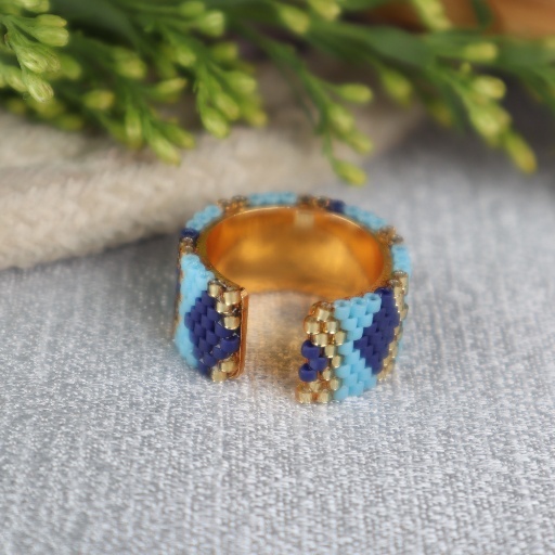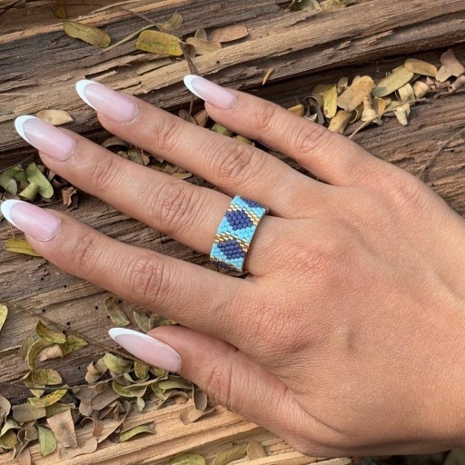 Inspired by open skies and endless vistas, the Blue Horizon Beaded Band features handwoven rows of sky blue, navy, and soft silver beads, accented by diagonal ribbons of gold. The wide band’s chevron pattern evokes a sense of movement and boundless possibility, while its lightweight, flexible design ensures lasting comfort. Whether worn solo or as part of a stack, the Blue Horizon Beaded Band brings a refreshing, contemporary edge to any ensemble—perfect for everyday adventures or special occasions.
