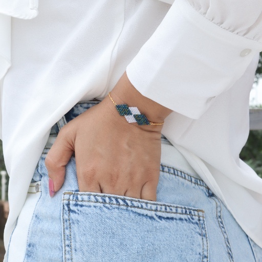 The Blue Mirage Bracelet captures the allure of a shimmering oasis — where cool blues meet crisp white and rich black in a striking diamond pattern. Handwoven with precision using high-quality glass beads, this bracelet is both modern and timeless. The alternating tones and shapes create a mesmerizing, prismatic effect, while the gold-tone chain adds a warm, luxurious finish.