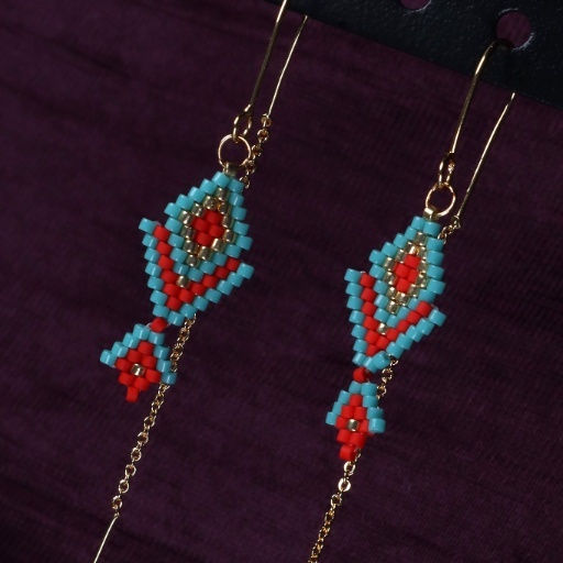 Brighten up your style with the Coral Sky Drop Threader Earring. Featuring a handwoven geometric design in coral red, turquoise blue, and subtle white, this earring is a stunning blend of vibrant color and delicate form. The gold-plated hook and slender threader chain add a graceful finish, making it perfect for both casual wear and special occasions. Lightweight and eye-catching, this earring brings a playful yet elegant touch to your accessory collection.