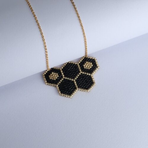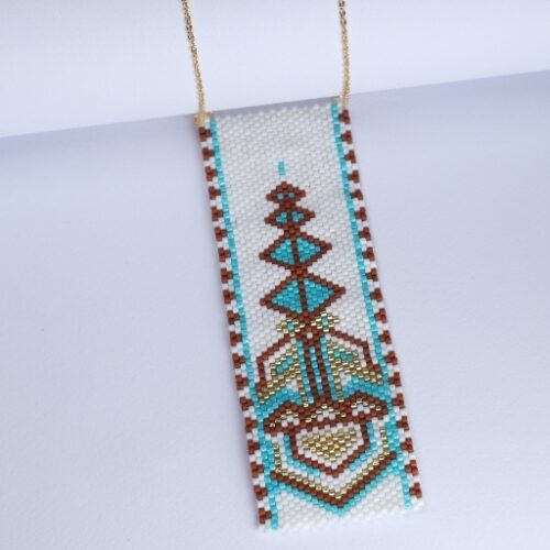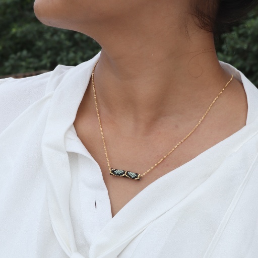Inspired by the mystique of desert nights and celestial alignments, the Desert Eclipse Beaded Necklace features a delicately handwoven tube of shimmering seed beads in hues of matte black, sage green, and champagne gold. The geometric diamond and cross patterns suggest hidden paths and guiding stars, offering a grounding yet radiant charm. Suspended on a fine gold chain, this necklace balances minimal elegance with artisanal detail, perfect for layering or wearing solo. Lightweight and striking, it makes a sophisticated statement day or night.