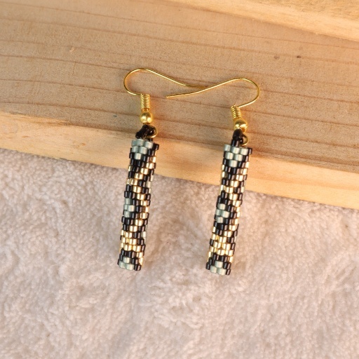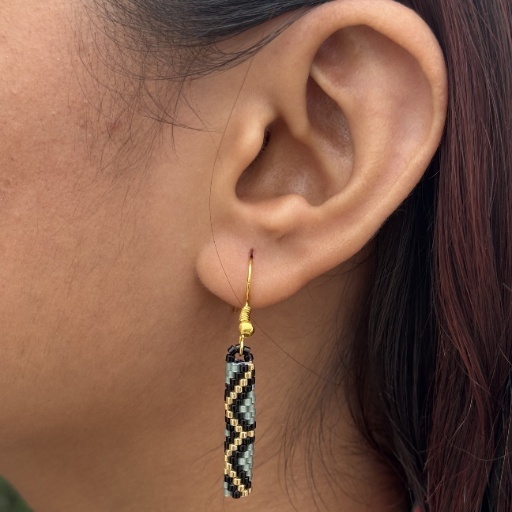 Unleash your inner strength and elegance with the Dragon Scale Earring. Crafted with precision using tiny glass beads, this earring features a sleek rectangular form adorned with a mesmerizing scale-like pattern. The shimmering dark tones paired with golden zigzags mimic the mythical texture of dragon scales, evoking a sense of power, mystery, and bold style.