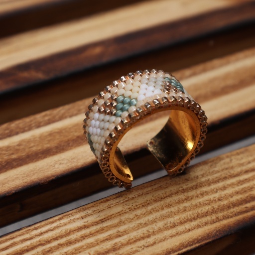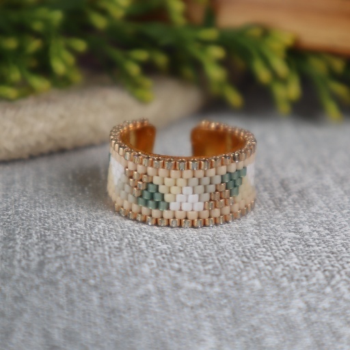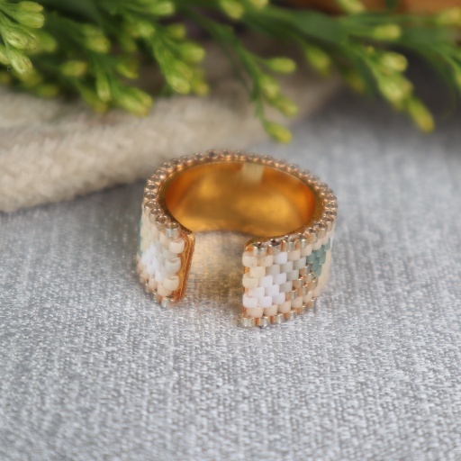 Capture the serenity of a blooming garden at sunset with the Dusk Petal Beaded Band. This wide, handwoven ring displays a soothing blend of blush, ivory, pale blue, and soft tan seed beads. The subtle, woven pattern evokes the gentle transitions of dusk light against delicate floral petals. The ring’s muted tones and intricate craftsmanship make it a sophisticated accessory for every day. Lightweight and flexible, it offers a comfortable fit for all-day wear and a touch of artisanal charm to both casual and elegant looks.