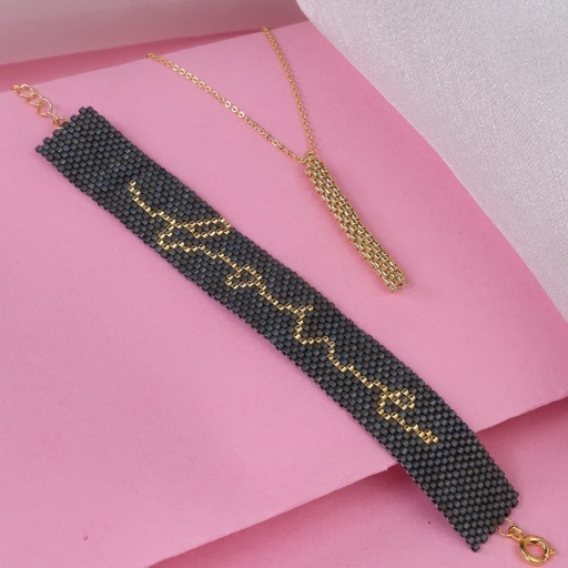 The Heartbeat Muse Set is where emotion meets edge. This striking duo features a matte black beaded bracelet handwoven with a heartbeat motif in shimmering gold, paired with a minimalist gold bead bar pendant on a fine chain. The bracelet evokes a sense of vitality and purpose—like a pulse captured in design—while the necklace balances it with quiet elegance.