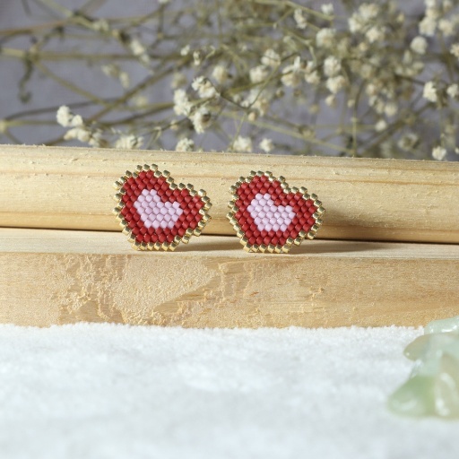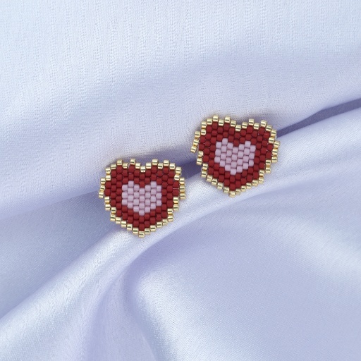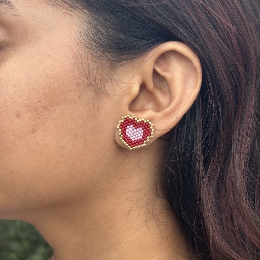 Let your style pop with the playful charm of the Heartpop Studs — bold, pixel-perfect hearts that bring a burst of love to any look. Featuring a two-tone heart design with a soft pink center surrounded by deep red and edged in radiant gold beads, these handcrafted earrings are the perfect blend of sweet and striking.