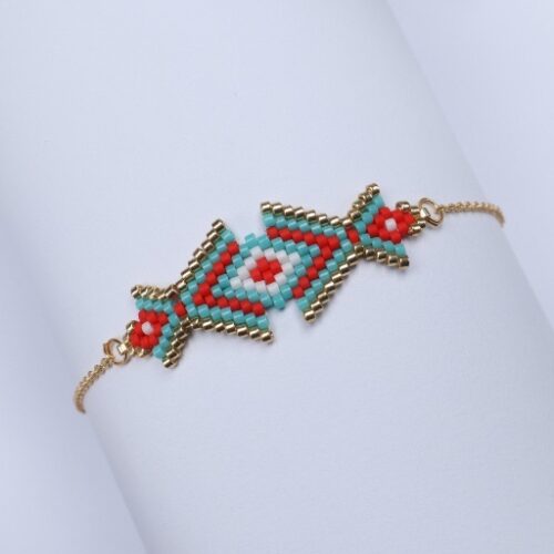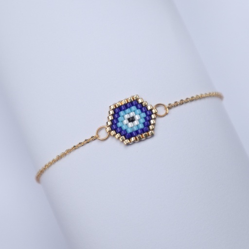 The Irish Ward bracelet is a graceful fusion of ancient symbolism and modern design. At its center lies a striking hexagonal motif in deep and light blues, edged with gold — reminiscent of a watchful eye or protective charm. This motif is delicately handwoven with fine beads, anchored on a sleek gold chain that wraps gently around the wrist.