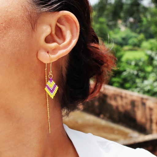 Fresh, playful, and full of charm, the Lemon Lavender Diamond Threader Earring is a vibrant statement piece that radiates joy. Featuring a handwoven diamond pattern in bright lemon yellow and soft lavender with white accents, this earring brings a refreshing pop of color to any outfit. Paired with a delicate gold-plated threader chain, it offers graceful movement and lightweight comfort. Perfect for sunny days, festive moods, or simply brightening your everyday style.