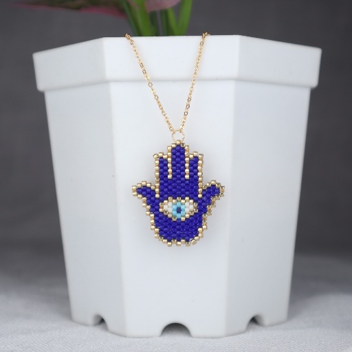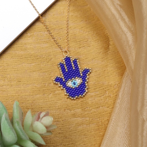 Radiating mystique and ancient symbolism, the Midnight Hamsa Beaded Pendant is a captivating piece crafted with precision and intention. Featuring the iconic Hamsa hand, a symbol of protection and good fortune, this pendant is handwoven with rich royal blue and deep navy beads. The central eye motif is formed from contrasting white and turquoise tones, framed with delicate gold accents that shimmer subtly with movement. Suspended from a fine chain, this pendant adds a bold yet spiritual charm to your everyday ensemble.