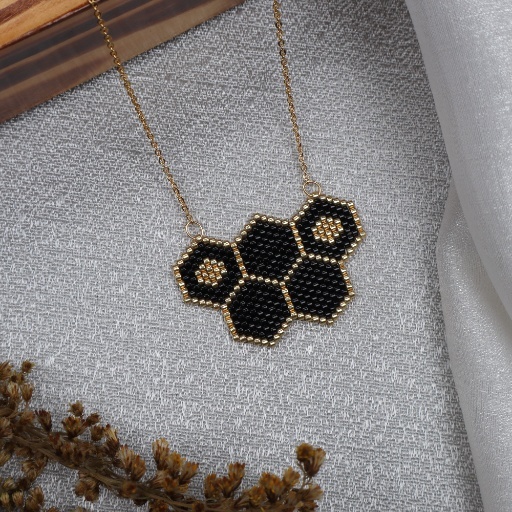 The necklace features a five-cell honeycomb centerpiece with subtle gold dot accents that shimmer against the matte black backdrop. Paired with coordinating hexagonal stud earrings—one solid and one with a golden heart—it brings a unique asymmetry that adds playful charm.