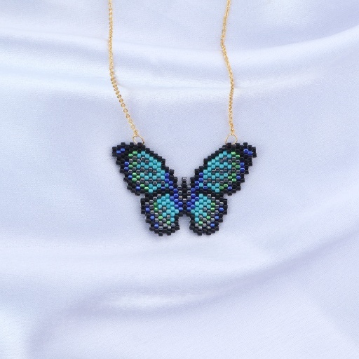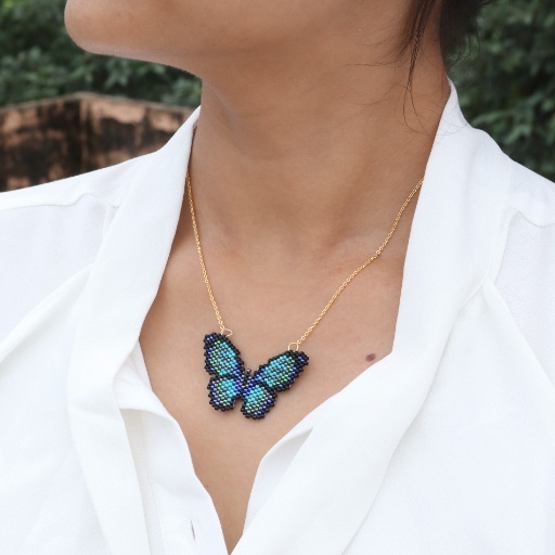 Take flight with elegance in the Midnight Wings Necklace, a stunning handcrafted piece featuring a beaded butterfly pendant in iridescent hues of teal, blue, and deep violet. Framed in sleek black, the butterfly shimmers like moonlight on water, offering a striking blend of bold contrast and delicate artistry.