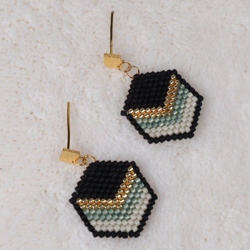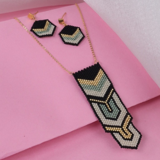 The Monarch Geo Set makes a commanding style statement with its striking blend of sharp symmetry and bold color contrasts. Featuring a sleek pendant necklace and matching hexagonal earrings, this handcrafted beaded set uses geometric layering in black, gold, sage green, and cream hues to create an architectural elegance that’s both edgy and modern.