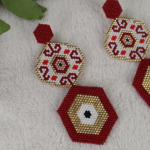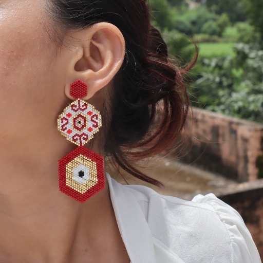 Bold, folkloric, and fiercely eye-catching, the Nazaria Mosaic Earrings blend protective symbolism with playful artistry. Inspired by the traditional nazar motif—believed to ward off evil—these statement pieces feature intricate beadwork in red, gold, and white, handwoven into powerful hexagonal and floral patterns.