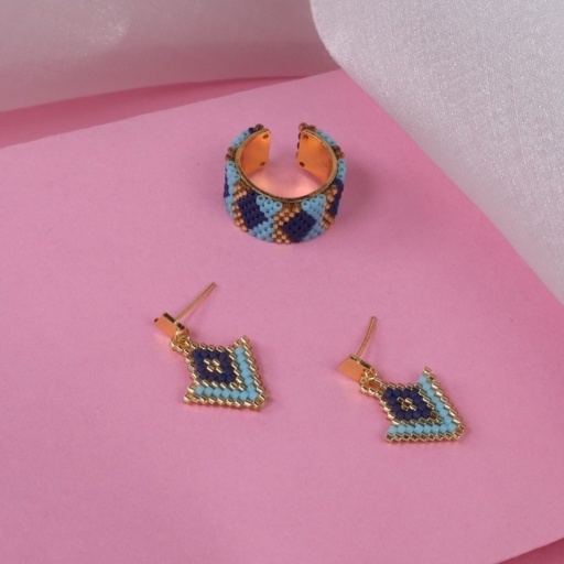 Dive into color with the Ocean Mirage Set, a vibrant jewelry pairing inspired by the depths of the sea and the shimmer of sunlit waves. This set features a wide adjustable ring adorned with a beaded harlequin pattern in ocean blue, turquoise, and golden tones, perfectly complemented by chevron-style earrings in matching hues. The geometric design and radiant colors bring playful elegance and bold energy, making this set a perfect companion for summer looks, vacation wear, or anytime you want to make waves.