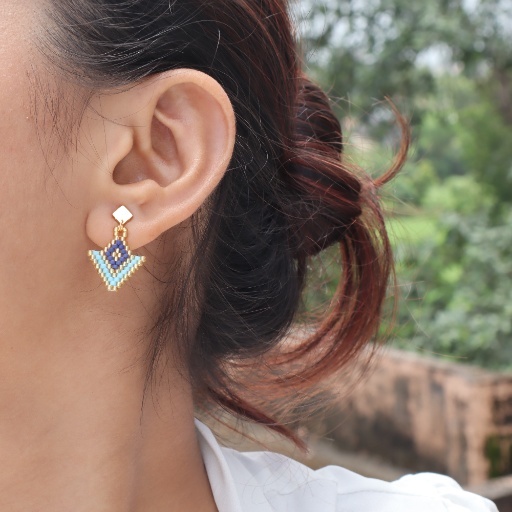 • Chevron drop earrings with turquoise, navy, and gold beadwork