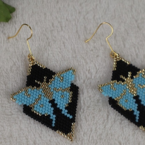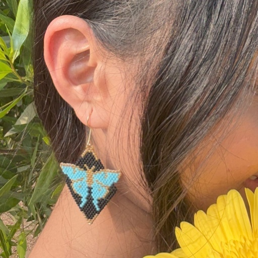Whimsical and bold, the Sky Butterfly Drop Earring is a wearable work of art. Handwoven with intricate detail, it features a striking sky-blue butterfly set against a deep black diamond-shaped background, framed with soft gold accents. The vibrant wings bring a sense of freedom and transformation, while the bold contrast adds a dramatic flair. Lightweight yet statement-worthy, this earring is perfect for nature lovers, dreamers, and anyone who wants their accessories to tell a story.