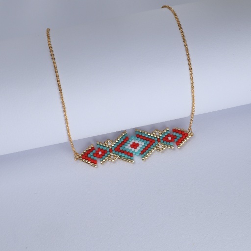 The Zayra Chevron Necklace is a vibrant blend of tribal flair and modern geometry. Handwoven with striking red, turquoise, white, and gold beads, its repeating chevron pattern channels a fierce and fearless spirit.